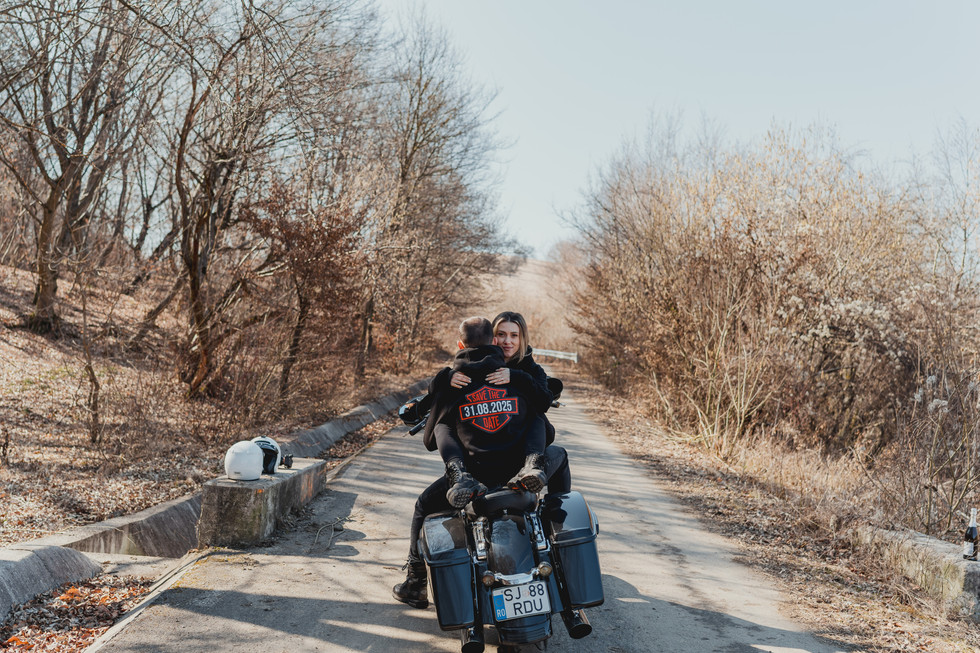 After the cozy morning, Mădălina & Radu geared up in their motorcycle outfits, ready to hit the road on their beloved Harley Davidson. We headed into nature, where the landscape opened up and the energy shifted — from intimate and quiet to bold and adventurous.
