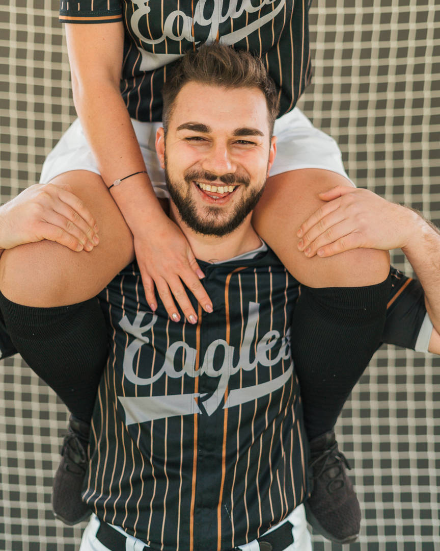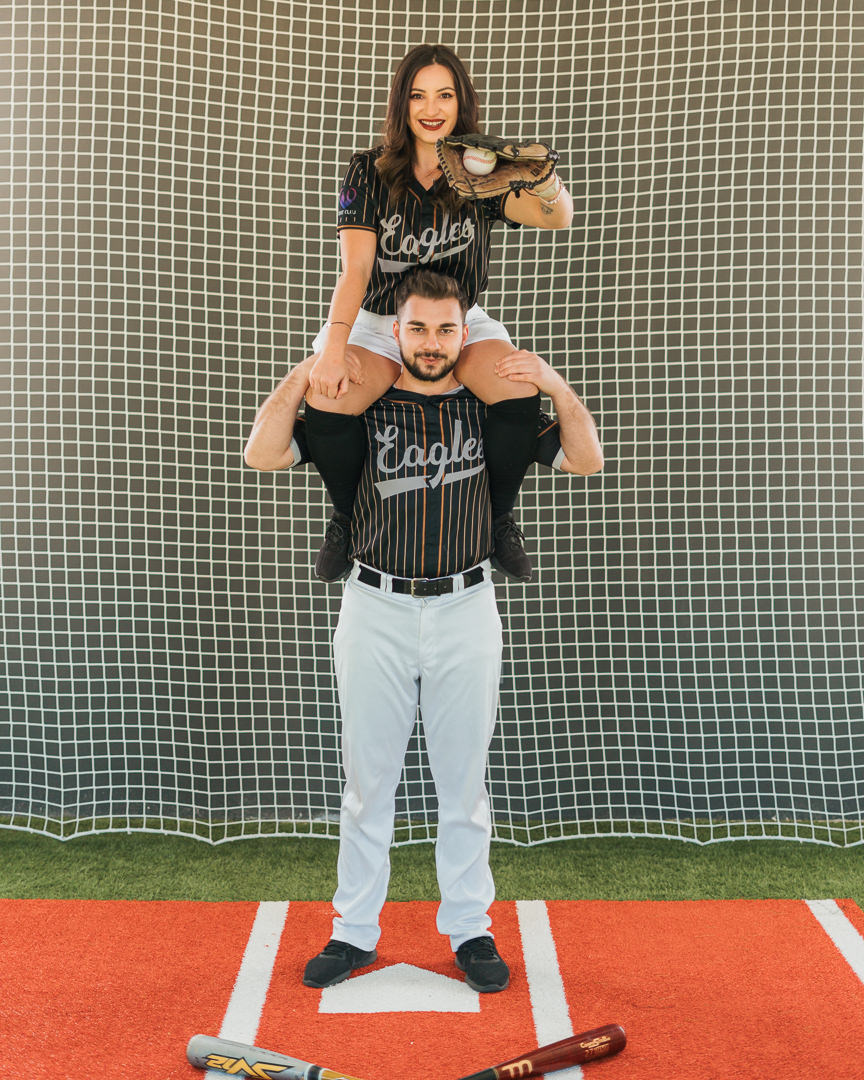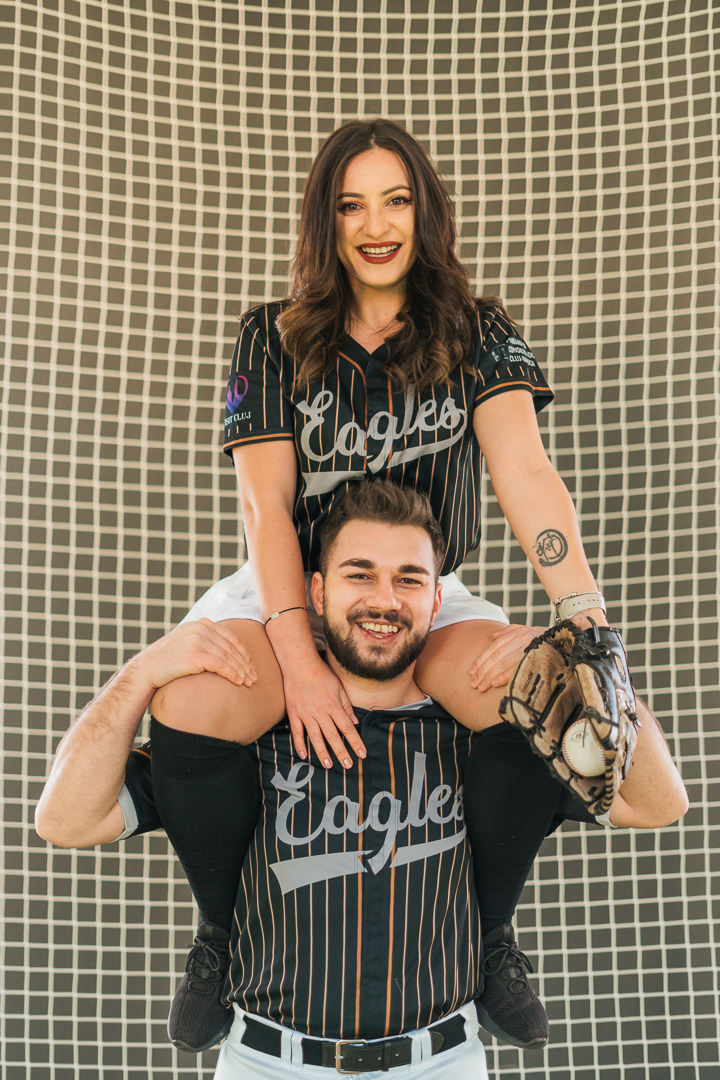 We headed to a very special place: the baseball field on the edge of the city – where Alexandra works as a coach. Wearing her uniform, she brought her passion and energy into the shoot, and together with Marian, they shared laughter, playful moments, and real connection among baseballs and wide open skies.