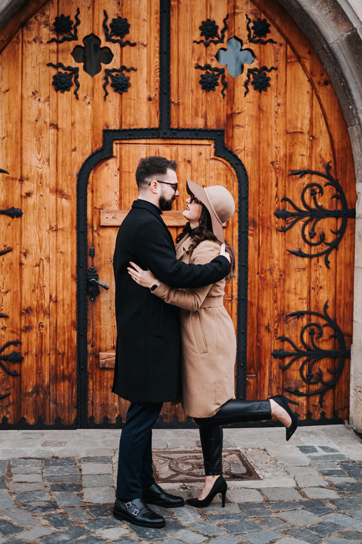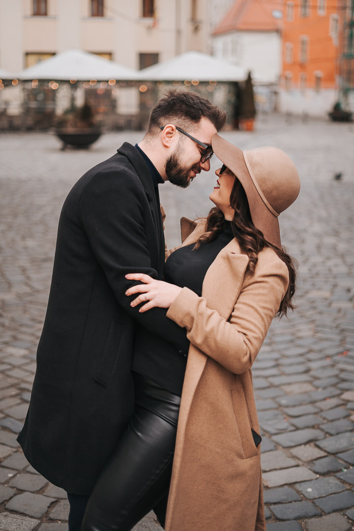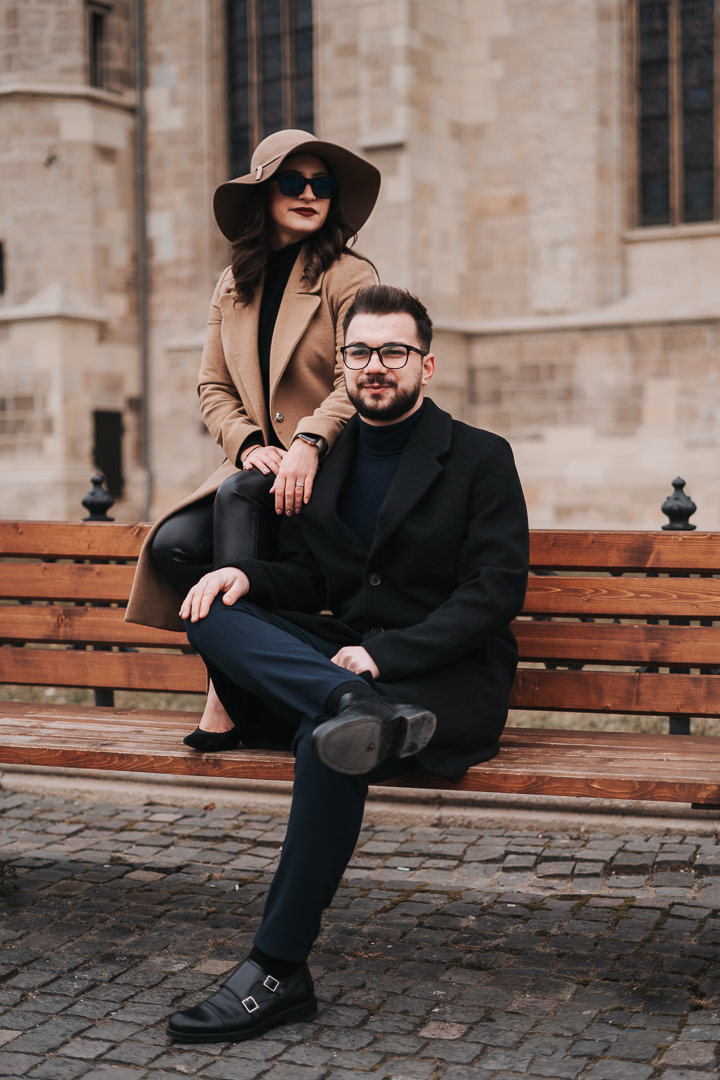 We started in Piața Unirii, where the soft morning light highlighted their warm smiles and genuine connection. Walking through the narrow streets and cozy corners of Cluj, we captured quiet moments of tenderness, including a heartfelt embrace in Piața Muzeului, filled with meaning and emotion.